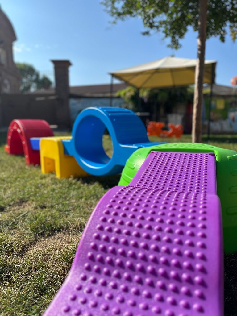 All’esterno si trova un ampio cortile interno ricoperto per tre quarti da un tappeto erboso, attrezzato con altalene, scivoli, casette e gazebi e pavimentato per la restante parte.